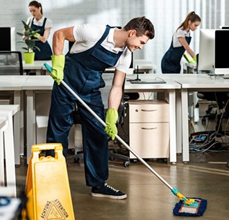 Regelmäßige Pflege von Geschäftsräumen, inklusive Staubsaugen, Wischen und Müllentsorgung.