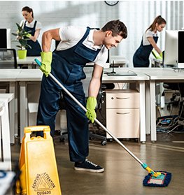 Regelmäßige Pflege von Geschäftsräumen, inklusive Staubsaugen, Wischen und Müllentsorgung.